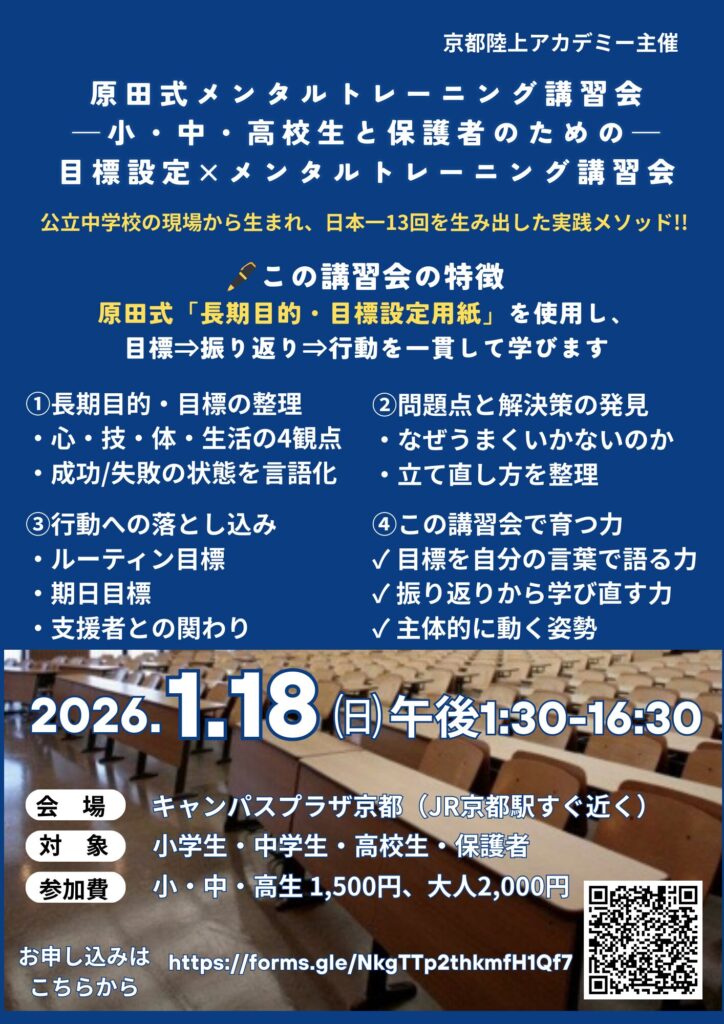 (一社)京都陸上アカデミーでは、2026年のスタートにあたり、今年度の目標設定・メンタル強化を狙いとした講習会を開催します。